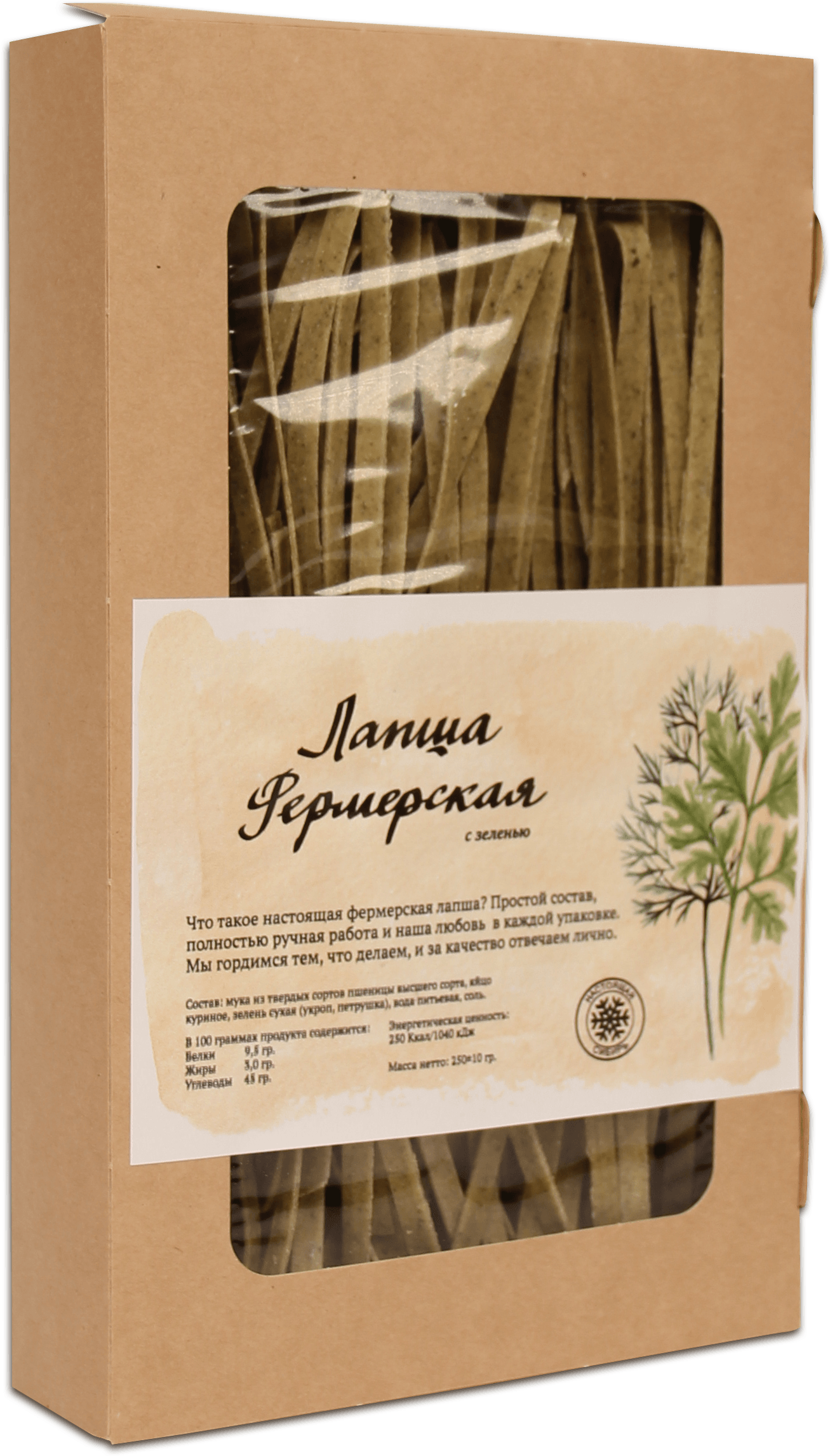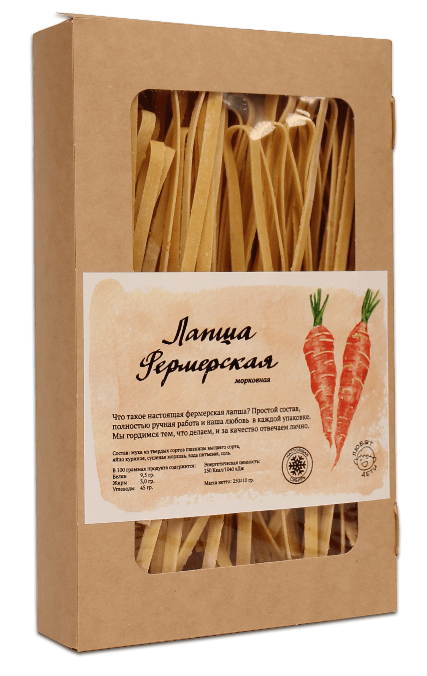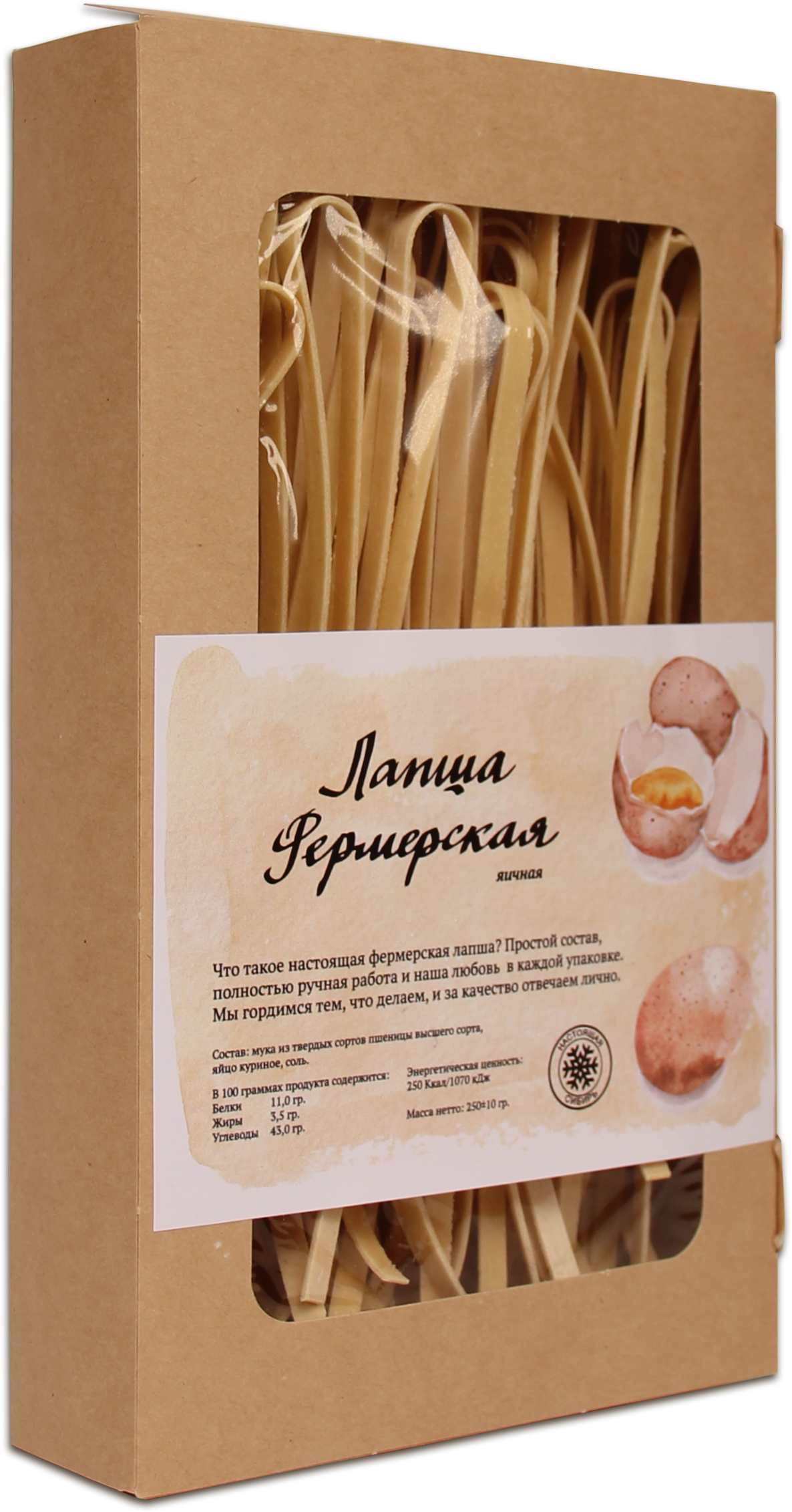 Лапша производится только из натуральных продуктов - муки твёрдых сортов пшеницы и фермерского яйца, без добавления консервантов искусственных красителей, усилителей вкуса.