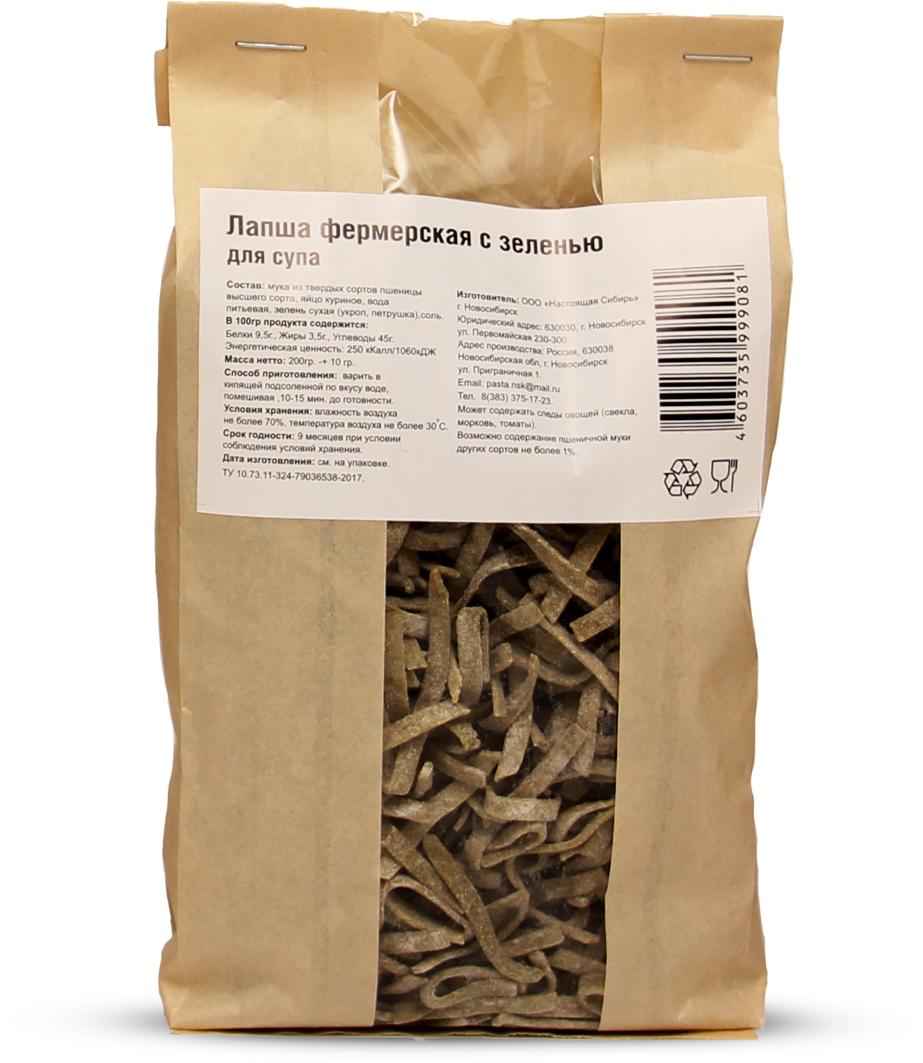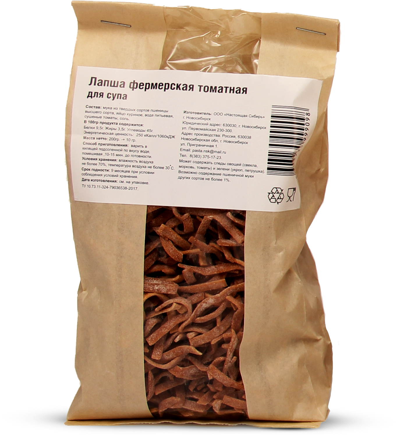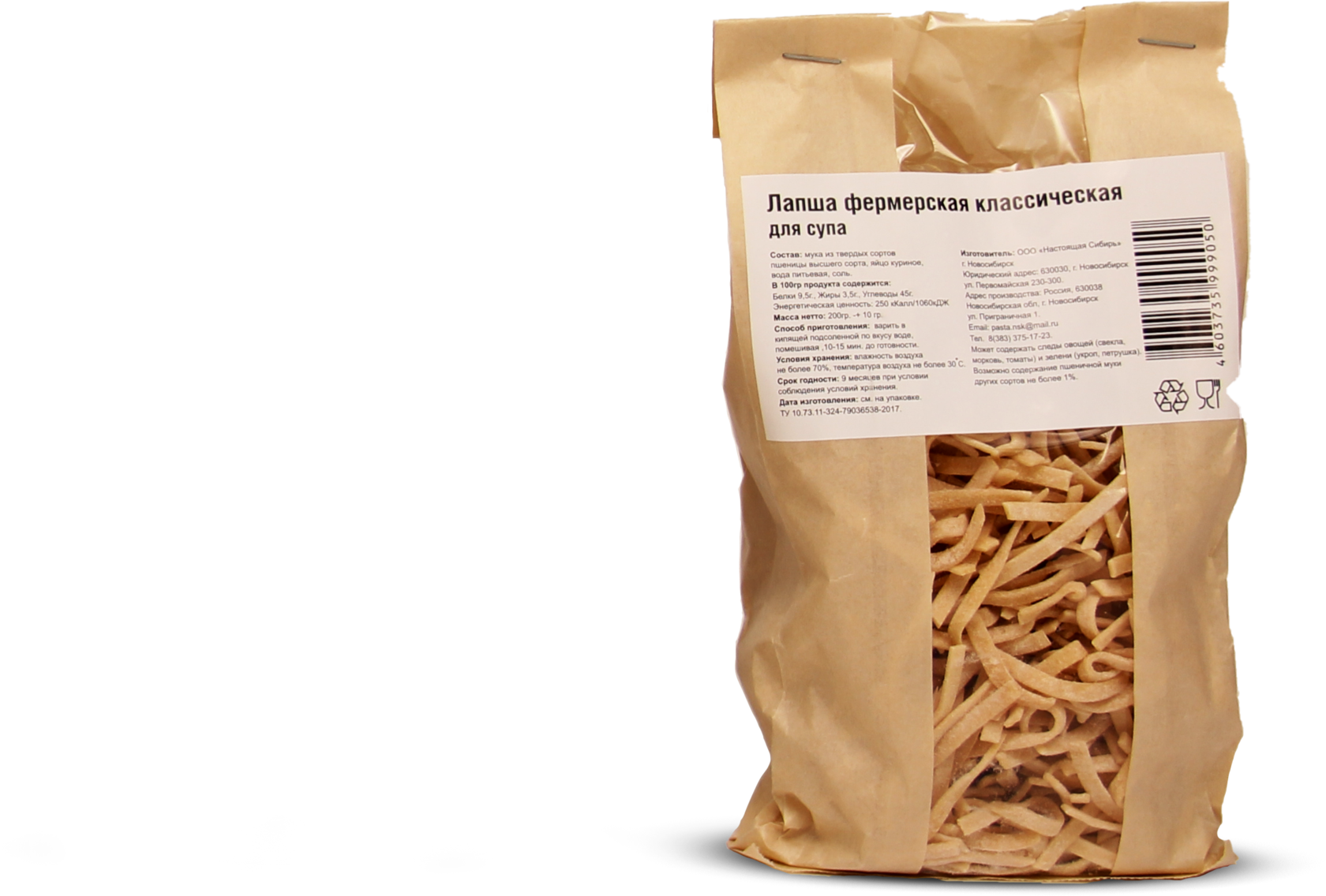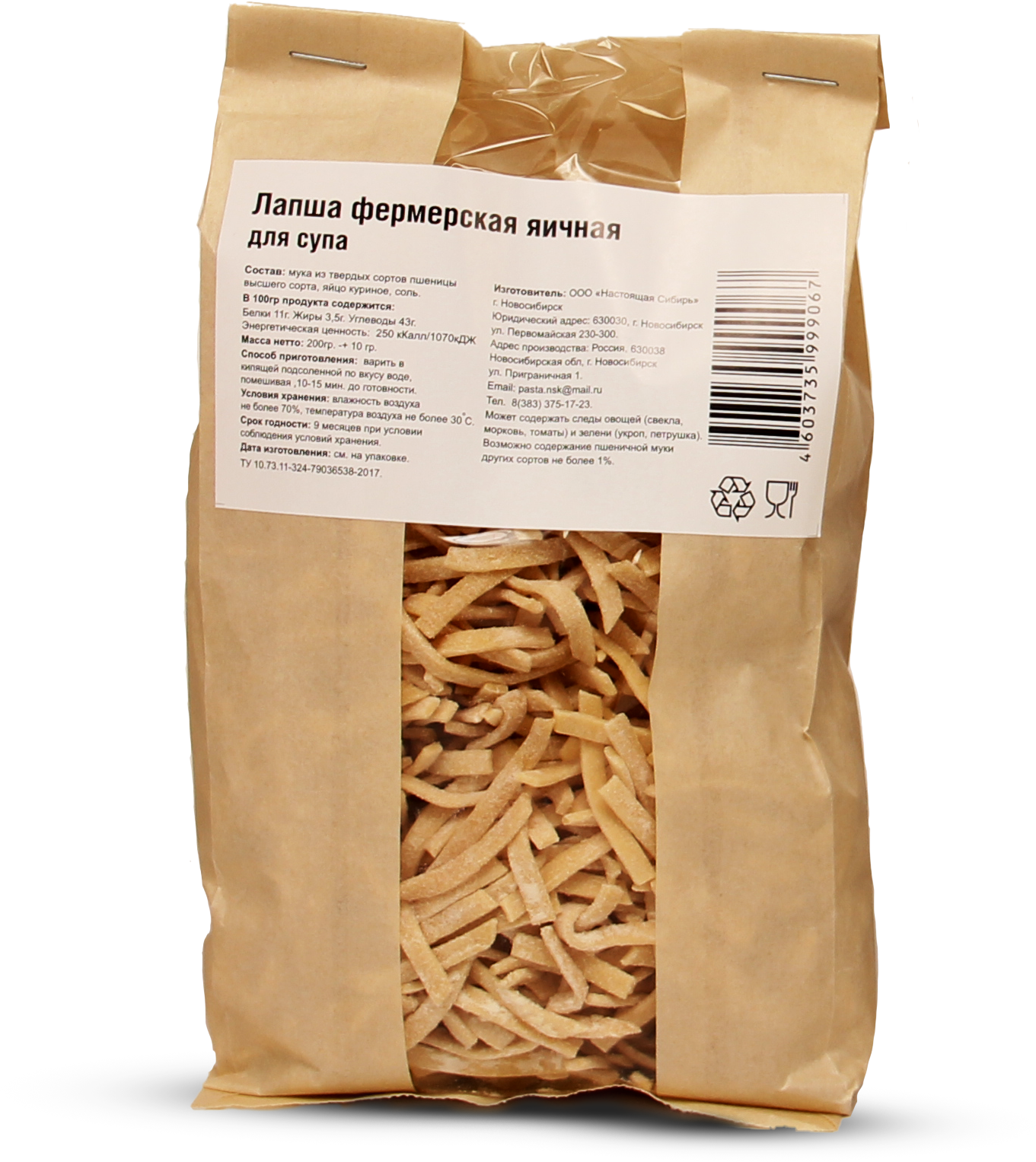 Лапша производится только из натуральных продуктов - муки твёрдых сортов пшеницы и фермерского яйца, без добавления консервантов искусственных красителей, усилителей вкуса,
